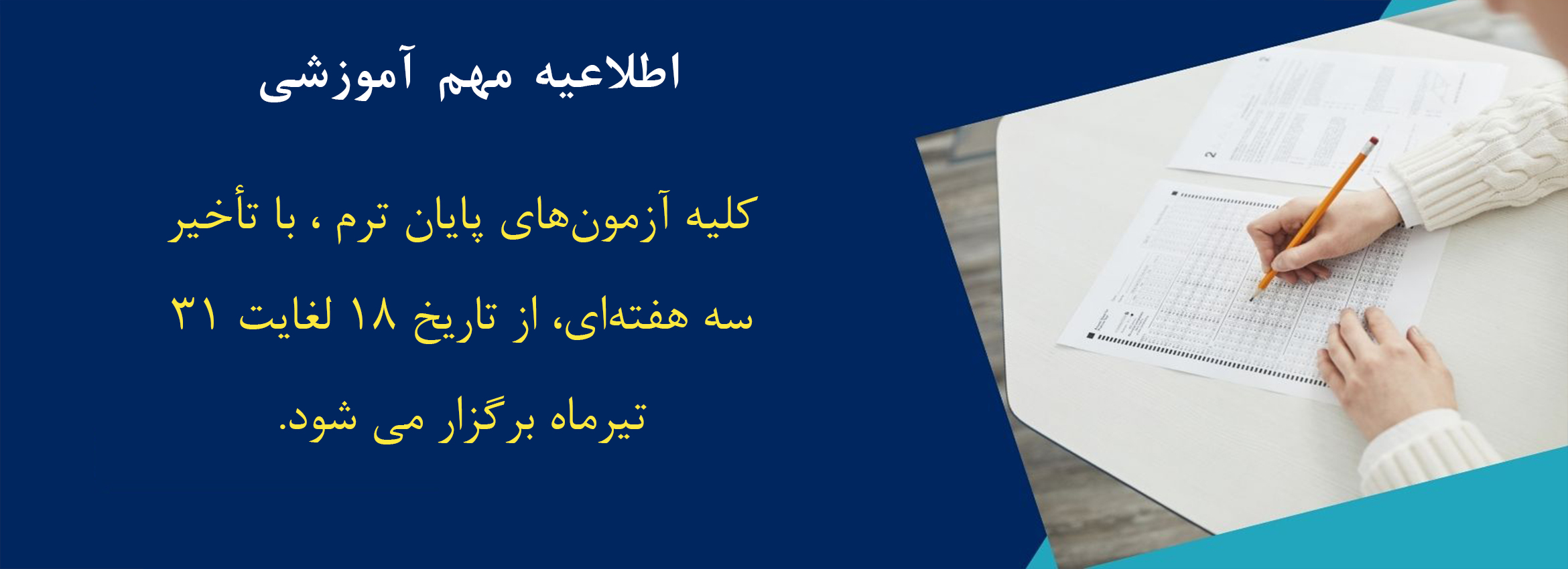 با توجه به شرایط پیشآمده و در جهت همسویی با تصمیمات دانشگاه مادر استان، مؤسسه آموزش عالی خردگرایان مطهر نیز برنامه امتحانات پایانترم را با اندکی تأخیر برگزار خواهد کرد.